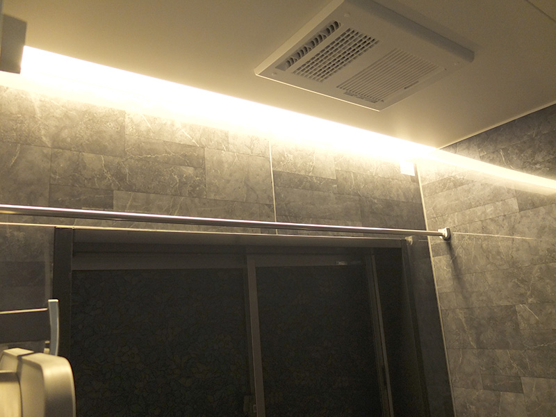 カラーリングがダークトーン基調のバスルームでしたので暗くなりがちですが、浴槽側に間接照明のような照明を採用されてそれだけでも十分に明るく、かっこいいラグジュアリーなバスルームに仕上がりました。