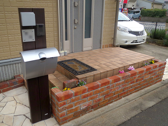 白アリに食われた木塀・ポスト・伸びきった雑草の除去後、シックですっきりとしたイメージになるよう機能ポストと煉瓦で外装を整えました。