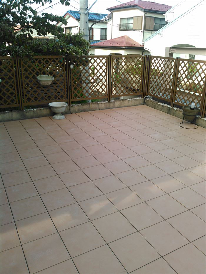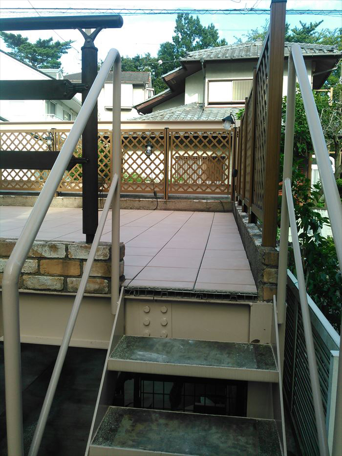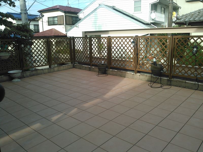 長年の雨風で劣化したデッキは撤去する際に通行人のことを考えて気を配る場面もありましたが、以前のものよりも小さなサイズのセラミック素材のタイルを使用することで奥行きを感じるため以前よりも広い空間に感じるかもしれません。