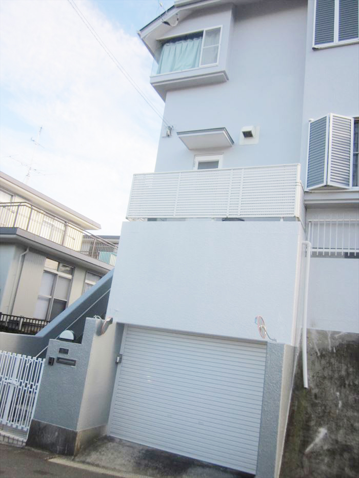 擁壁のコンクリートは爆裂してしまい、まずは爆裂部分の補修工事を行い、全体を塗装させていただきました。