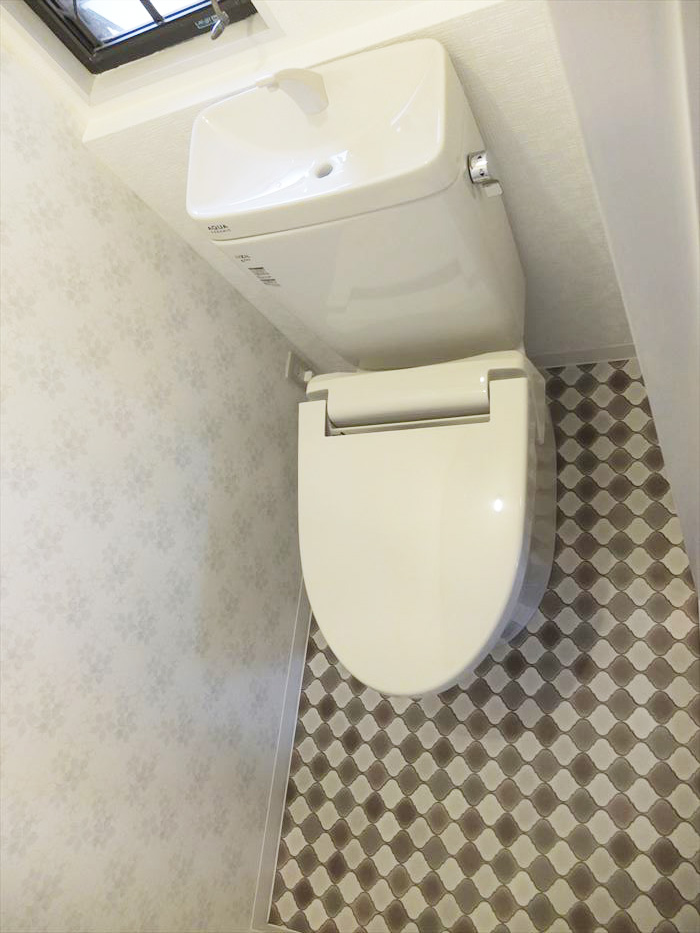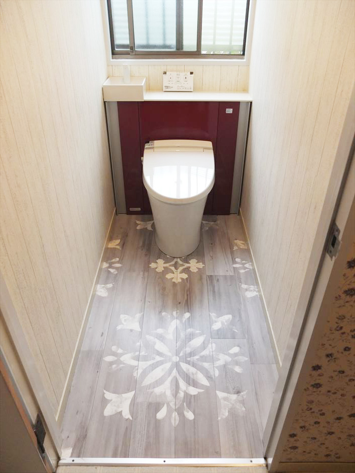 トイレの種類や色味は決めていましたが、内装の打ち合わせで直感で選定したグレー調の木目柄×ステンシル柄のクッションフロアではレストルームが暗くなってしまうか心配しましたが、工事完了した時には感動してしまう程マッチした仕上がりになりました。