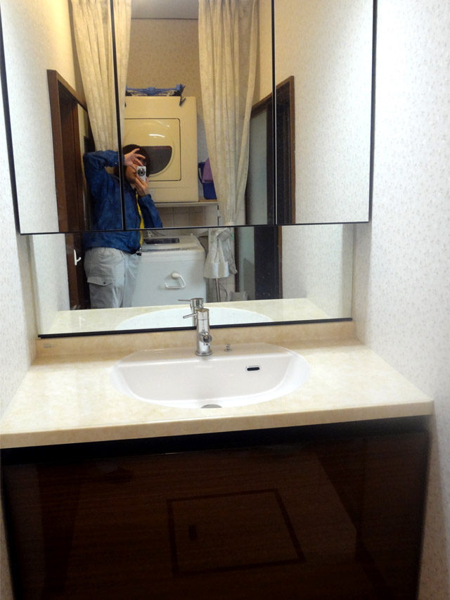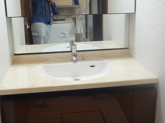 内装材が明るくなり、洗面化粧台の扉柄が落ち着いた鏡面の木目調に仕上がり、とてもきれいになりました。