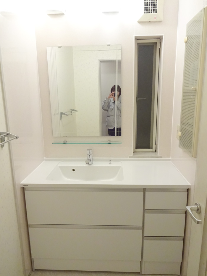キッチンパネル・壁紙はお客様と一緒に選ばせていただき、キッチンパネルはライトローズ色、クロスは花柄で洗面空間を仕上げました。お客様と一緒に選ぶ時間は楽しく、私も満足しております。有り難うございました!