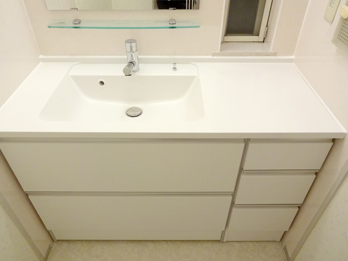 壁から壁までのぴったりの洗面台。今回提案させていただいたのは、パナソニック製シーラインカウンタータイプ。